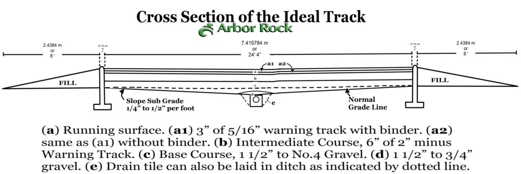As has been mentioned, the base course of the track will vary from 3” –12”, depending on the type of drainage to be used or upon the funds available.